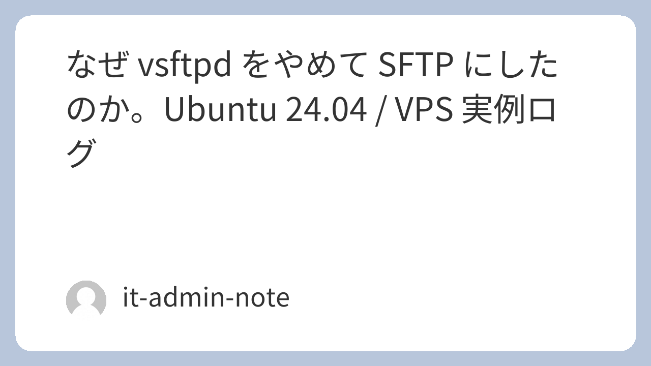 最初は何となく FTP(vsftpd)を入れたのですが、実運用を考えると違和感が積み重なり、最終的に SFTP(SSH)一本化 に切り替えました。